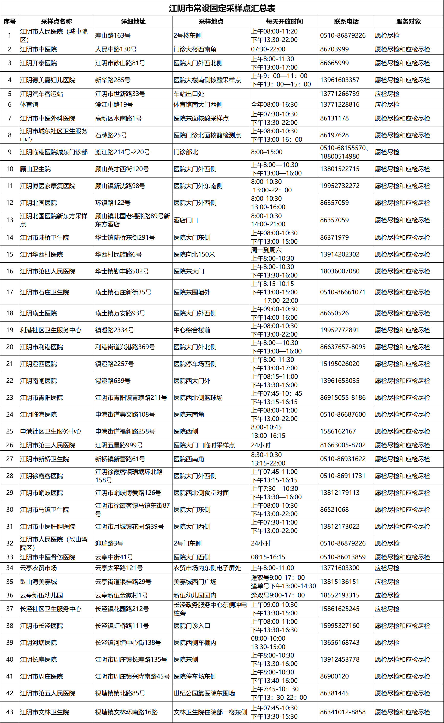 江阴市常设核酸检测点最新汇总表(江阴市常设核酸检测点最新汇总表格)