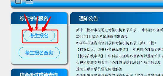 1、进入心理咨询系列综合服务系统(https://jcpx.psych.ac.cn/),点击首页的『考生报名』