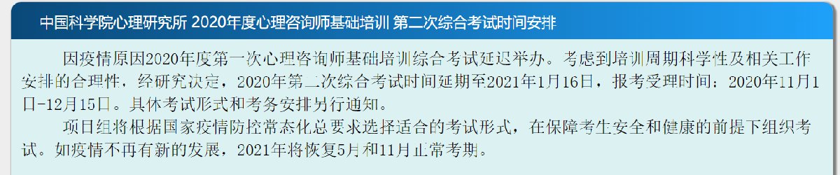 因疫情原因2020年度第一次心理咨询师基础培训综合考试延迟举办。考虑到培训周期科学性及相关工作安排的合理性,经研究决定,2020年第二次综合考试时间延期至2021年1月16日,报考受理时间:2020年11月1日-12月15日。具体考试形式和考务安排另行通知。