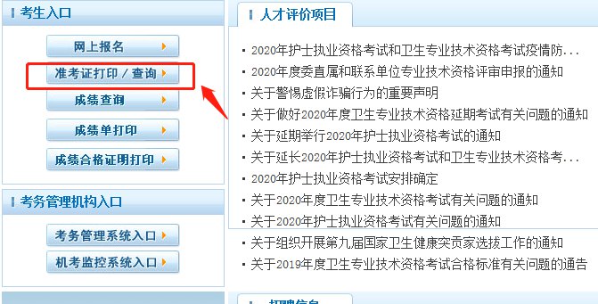 1、登录中国卫生人才网,选择首页左侧考生入口中的【准考证打印/查询】;