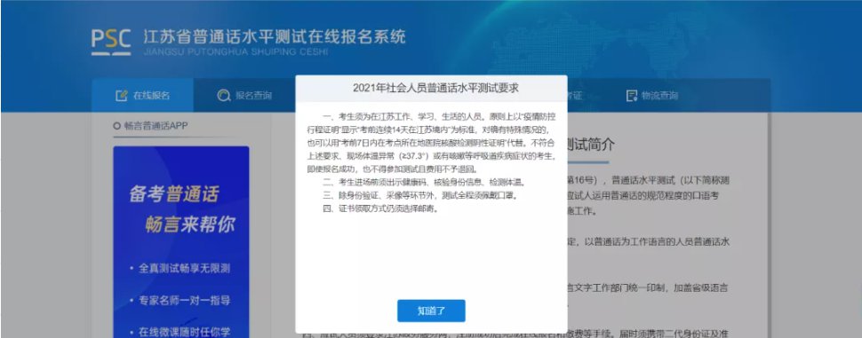 1、实名注册并登录江苏政务服务网(http://www.jszwfw.gov.cn),搜索“普通话水平测试”或点击进入省教育厅旗舰店在线报名。