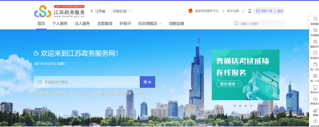1.在江苏政务服务网首页,横向滚动菜单区域,或在“综合服务旗舰店——省教育厅旗舰店”中找到“江苏省普通话水平测试在线报名”(http://www.jszwfw.gov.cn/col/col140135/index.html),点击进入。