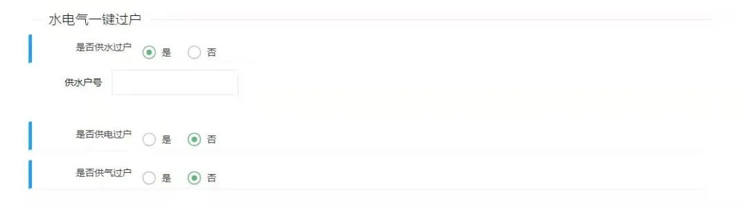 填报时,一键勾选是否需要进行供水过户,可以填写供水户号,如果不记得户号也没关系哦,水务工作人员核查后会帮助输入~