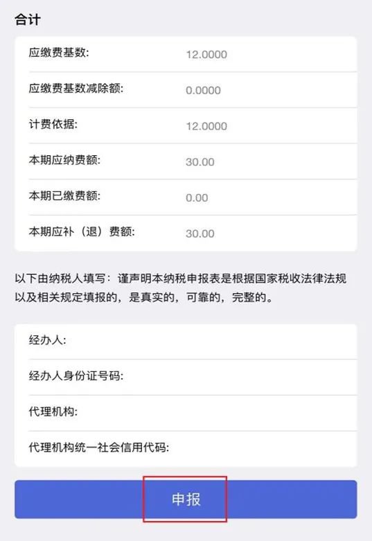 4、完成后会生成您填写的申报信息预览,如无其他申报事项,填写“经办人信息”后点击【申报】。