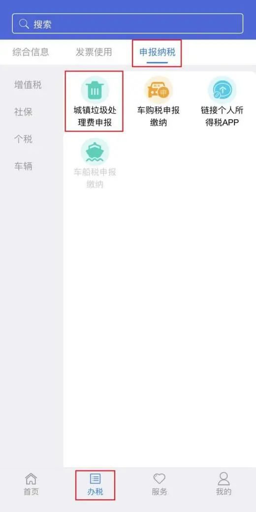 1、登录后,进入“江苏税务”APP主界面。选择【办税】,点击【申报纳税】—【城镇垃圾处理费申报】。