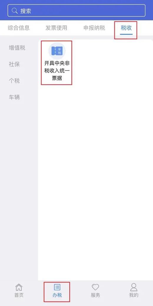 1、申报缴费完成后,如需开具缴费凭证,您可到【办税】—【税收】—【开具中央非税收入统一票据】模块进行开具,进入后选择【开具查询】。