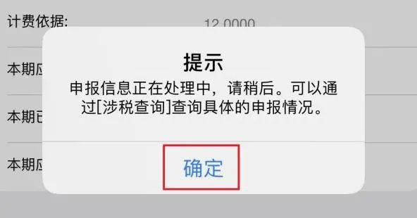 5、点击【申报】后会出现申报信息正在处理中的提示信息,点击【确定】,申报完成。