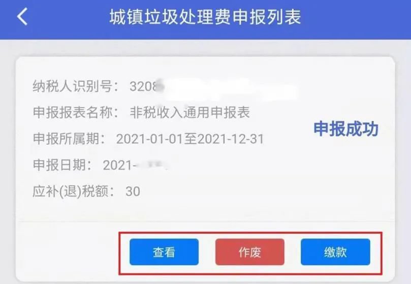 进入“城镇垃圾处理费申报列表”页面,本页面可进行【查看】、【作废】、【缴款】操作。
