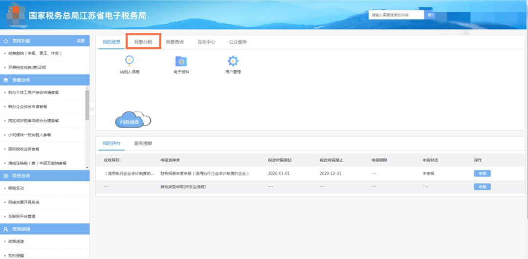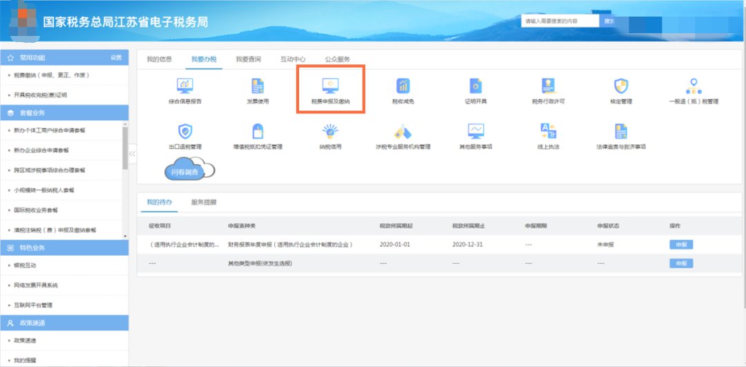 1.登录“国家税务总局江苏省电子税务局”,选择【我要办税】—【税费申报及缴纳】。