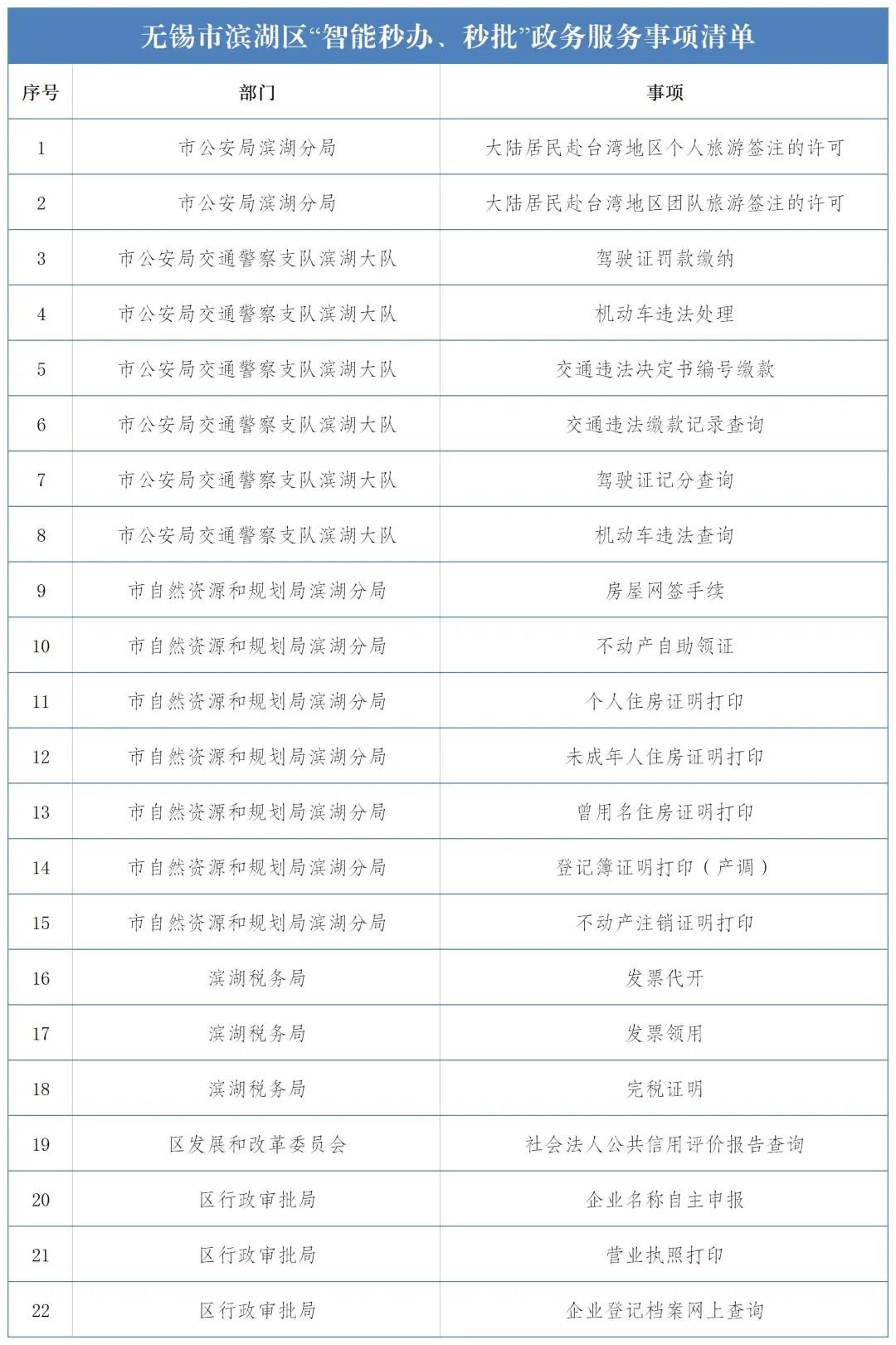滨湖首批22项区级“智能秒办、秒批”政务服务事项清单公布,本次清单涵盖了房屋网签备案、税务发票领用、交通违法处理等22项高频事项,覆盖行政审批、公安、交警、自然资源规划、税务、社会信用等6大领域。