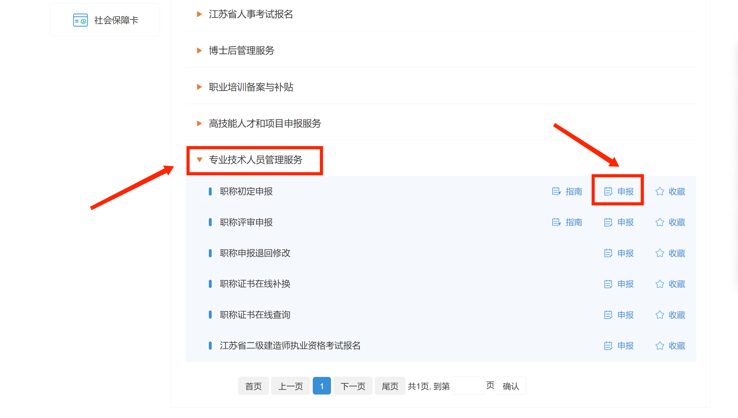 2. 找到“专业技术人员管理服务”点开,点击“职称初定申报”所在行后面的“申报”