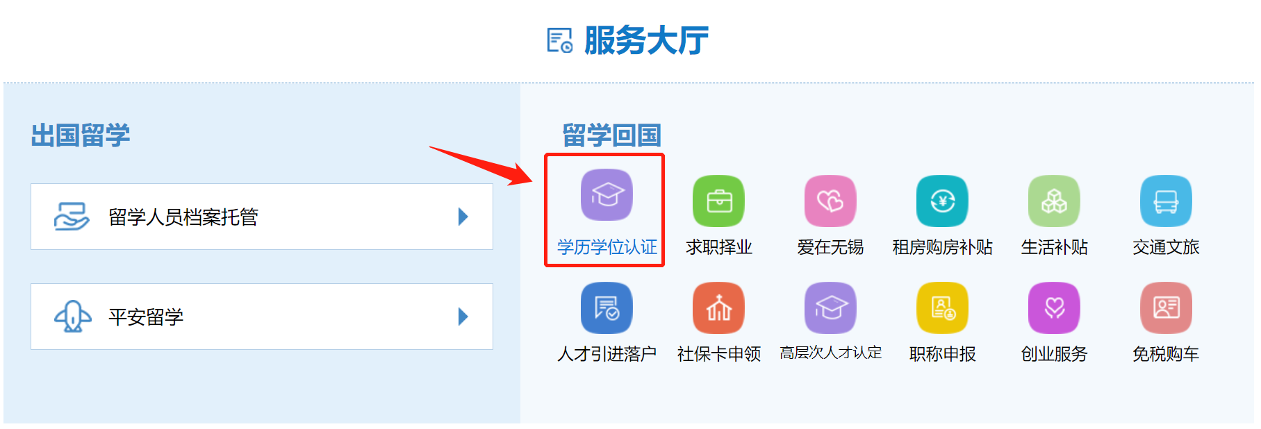 入口二:进入无锡留学人员一站式服务平台(点此进入),下滑页面找到【学历学位认证】,点击进入即可