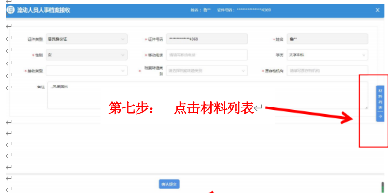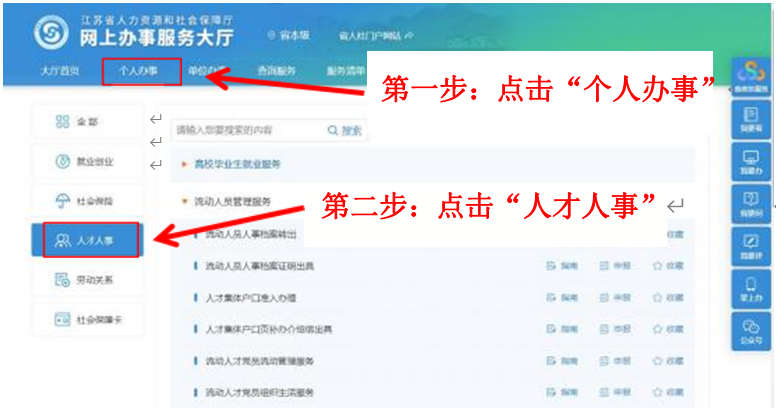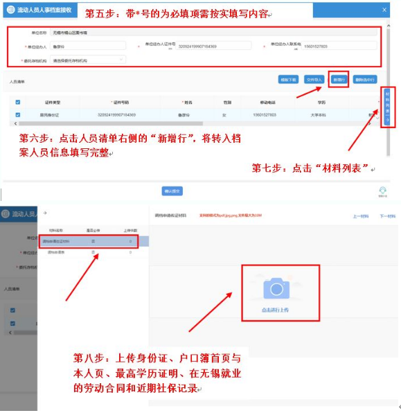 点击个人办事——人才人事——流动人员管理服务——流动人员人事档案接收申报——选择推送人才中心——点击保存——按实填写内容——点击材料列表——上传身份证、户口簿首页与本人页、毕业证书(若选择就业调入档案,需提交在无锡就业的劳动合同和近期社保记录)——确认提交
