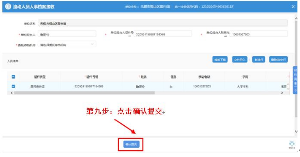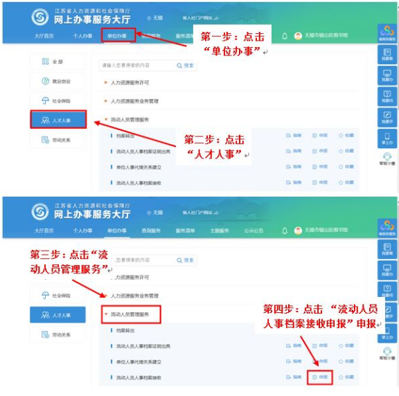 点击单位办事——人才人事——流动人员管理服务——流动人员人事档案接收申报——选择推送人才中心——点击保存——按实填写内容——点击材料列表——上传身份证、户口簿首页与本人页、最高学历证明、在无锡工作的劳动合同和近期社保记录——确认提交