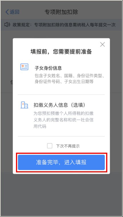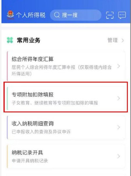 纳税人登录手机个人所得税APP后,可通过“首页——常用业务——专项附加扣除填报”或“办税——专项附加扣除填报”进入专项附加扣除填报界面,并选择“婴幼儿照护费用”专项附加扣除。