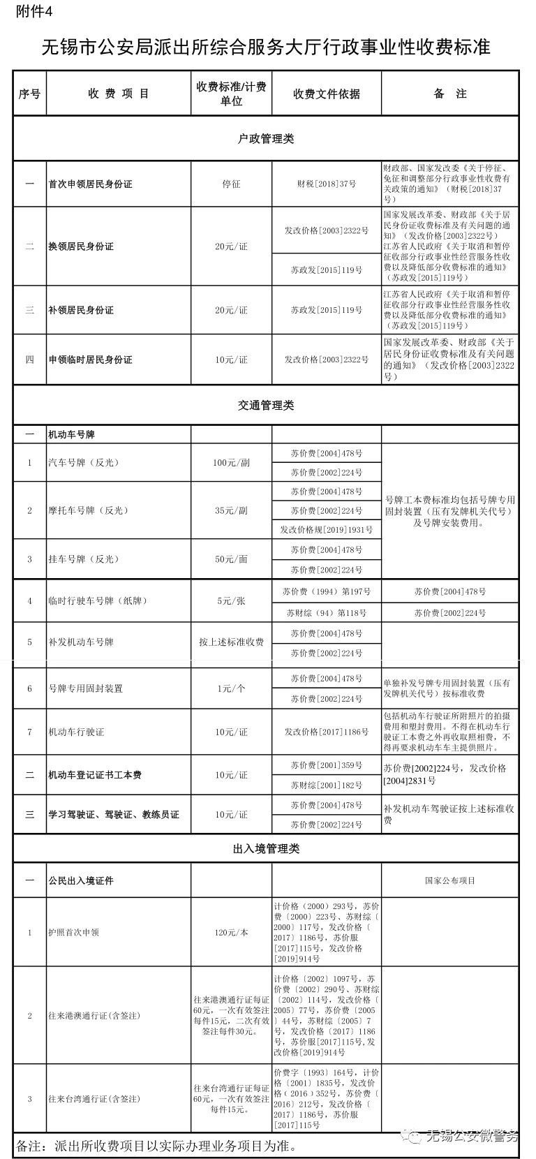 无锡公安局派出所综合服务窗口收费标准