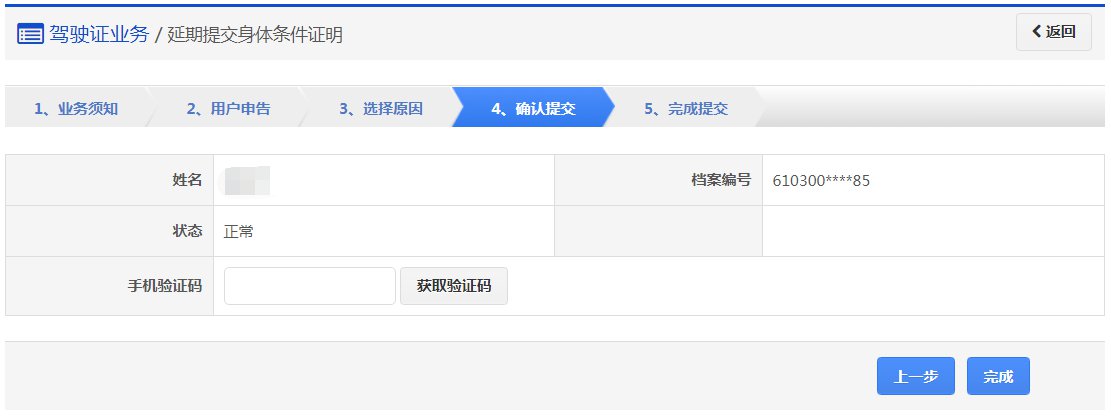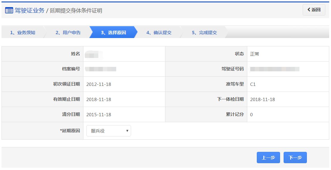 在该步骤,界面显示驾驶证的基本信息,用户认真确认各项信息无误后选择延期原因,点击【下一步】进入步骤4【确认提交】。
