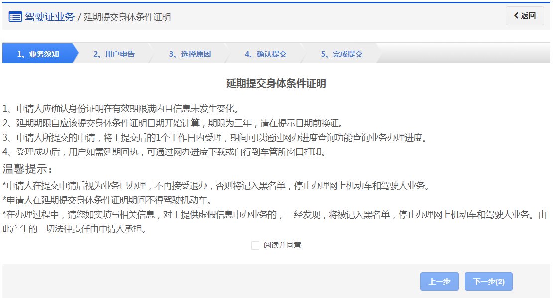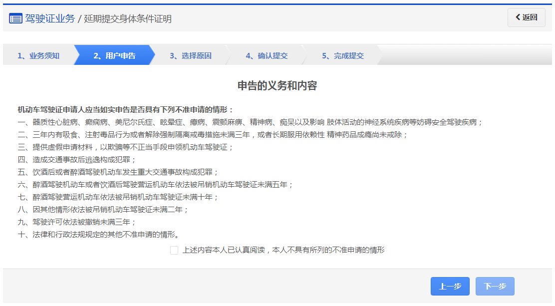 在该步骤,用户需认真阅读其内容,包括:办理延期提交身体条件证明需要注意的各项内容和相关责任,如下图所示。同意的,勾选“阅读并同意”,点击【下一步】进入步骤2【用户申告】。