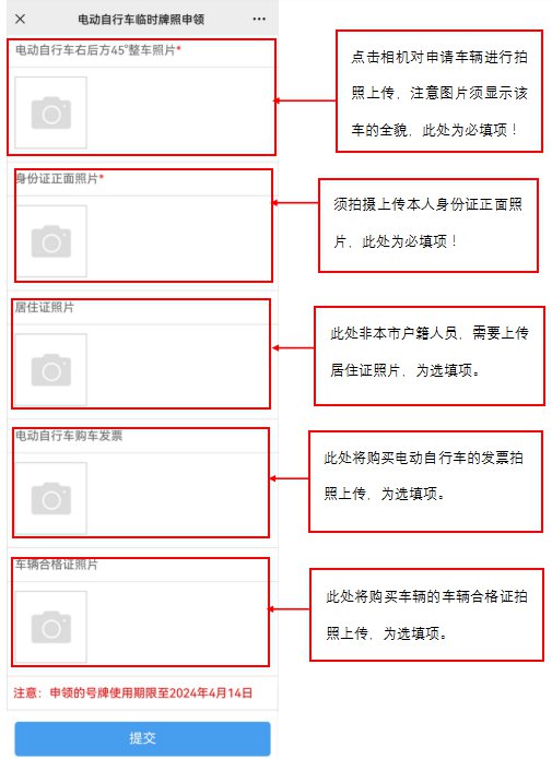 (1)车辆所有人通过“江阴交警”或“江阴公安微警务”微信公众号——“电动自行车临时牌照申领”模块进行备案信息预录入;
