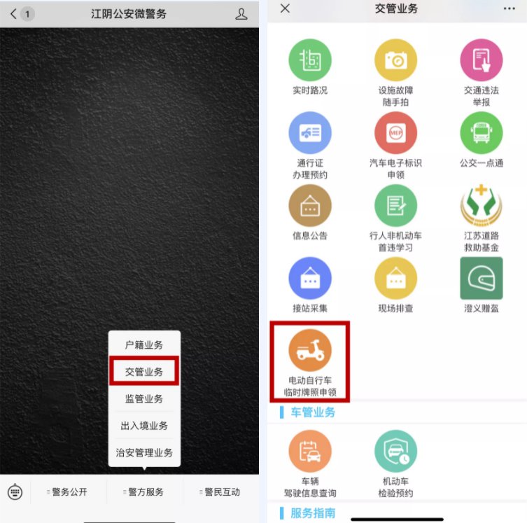 (1)车辆所有人通过“江阴交警”或“江阴公安微警务”微信公众号——“电动自行车临时牌照申领”模块进行备案信息预录入;