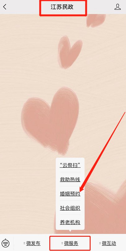 (2)关注微信公众号“江苏民政”,在下方菜单栏点击:微服务——婚姻预约——预约婚姻登记——结婚登记——选择登记机关——无锡市——江阴市民政局婚姻登记处——选择登记时间。