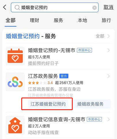 (1)进入支付宝后在搜索框搜索“婚姻登记预约”——选择:预约婚姻登记——结婚登记——选择登记机关——无锡市——江阴市民政局婚姻登记处——选择登记时间。