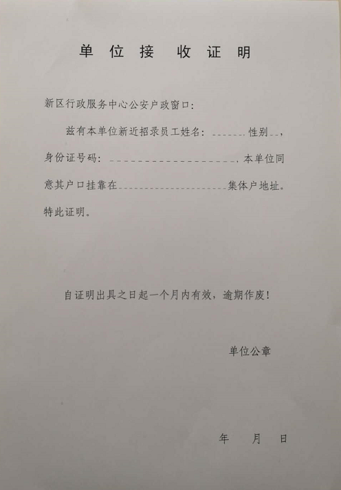 如果落户单位集体户,需要提供单位接收证明,具体可以参考: