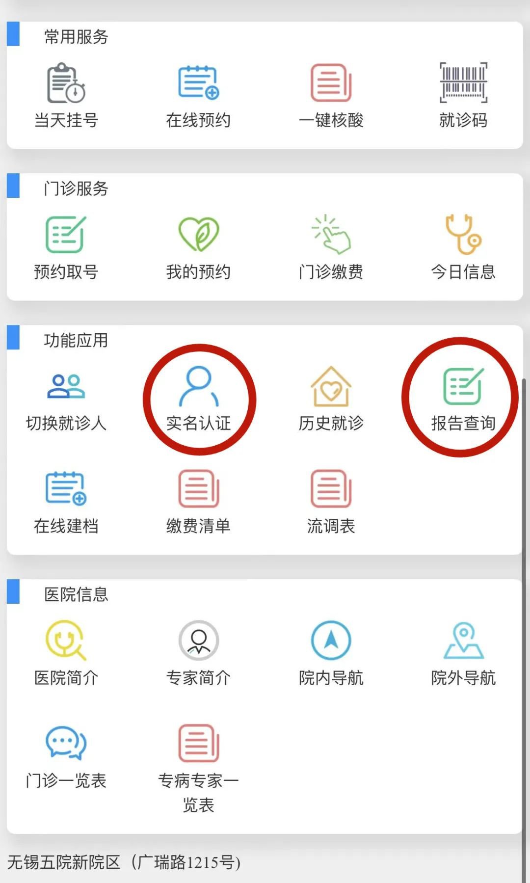 关注“无锡市第五人民医院”公众号:在线预约→就诊服务→实名认证→报告查询