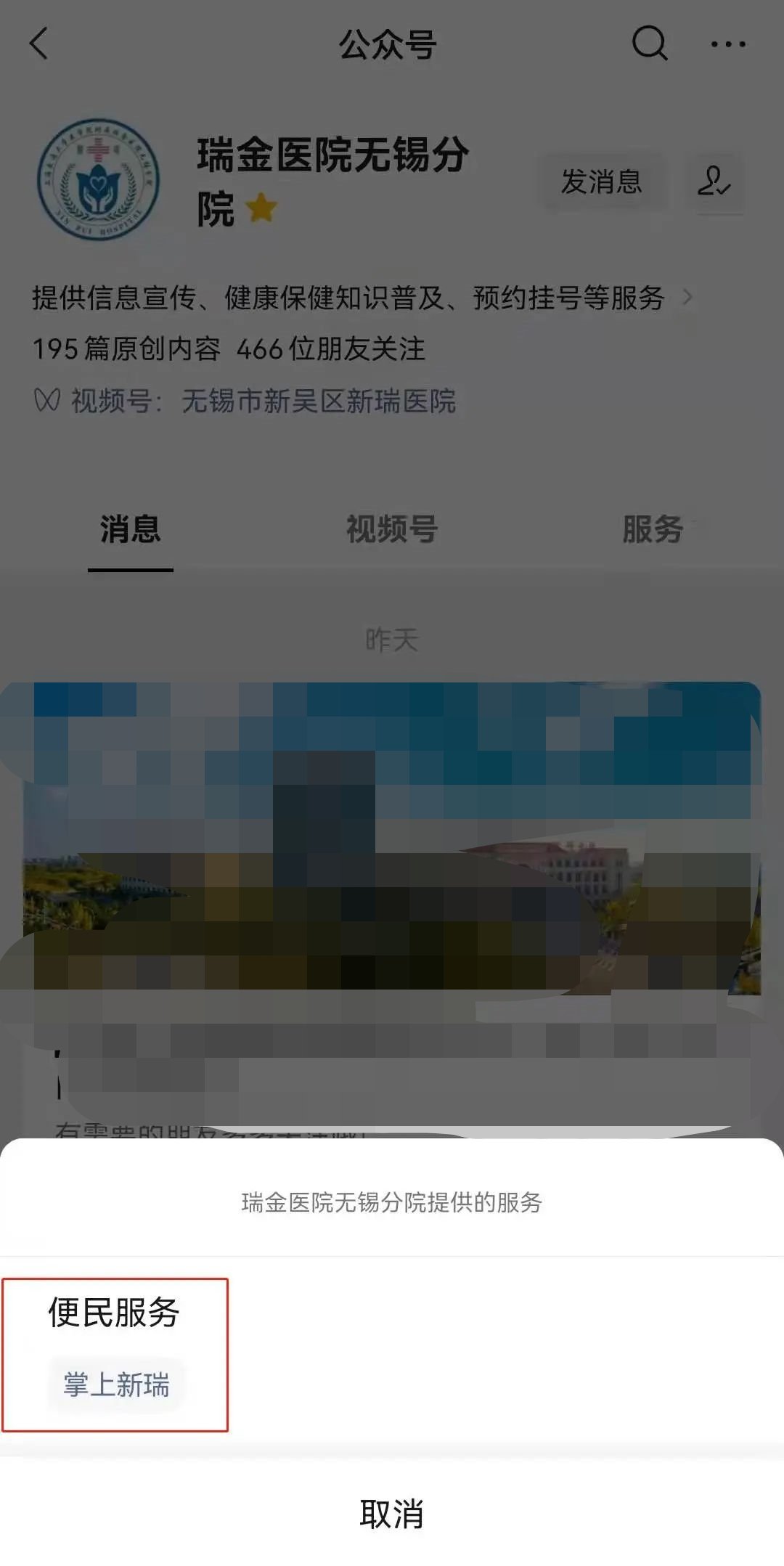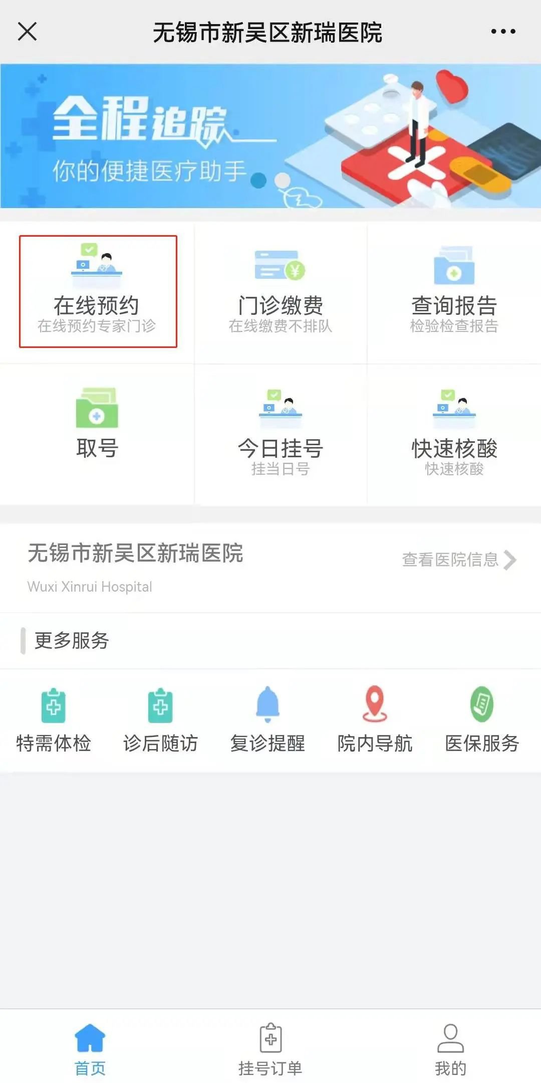 在公众号“瑞金医院无锡分院”首页点选“服务”后,再点选“掌上新瑞”进入小程序界面。