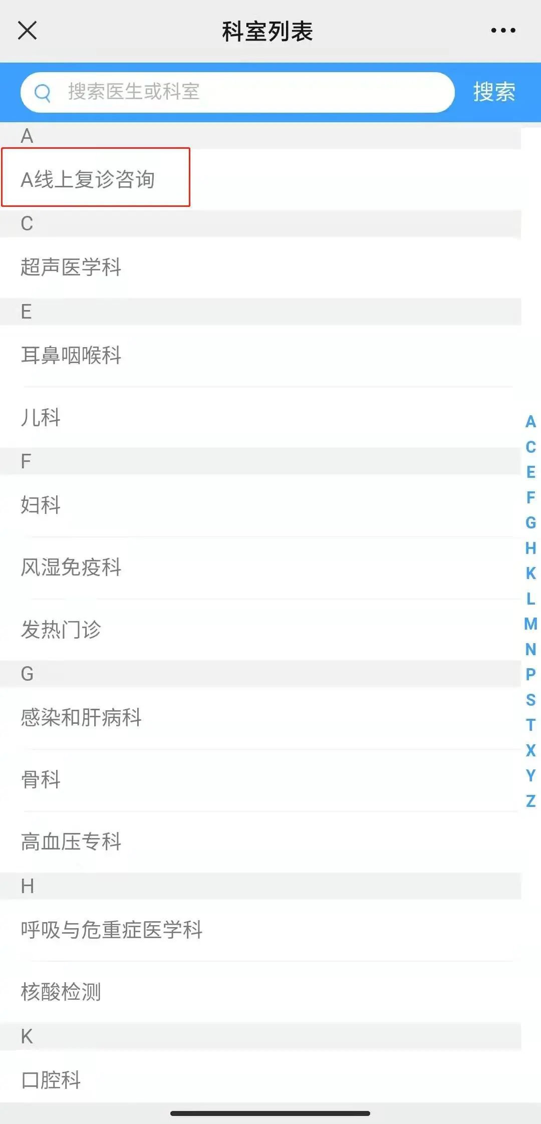 在小程序中点选“在线预约”,进入预约界面点选“线上复诊咨询”后按需进行预约。