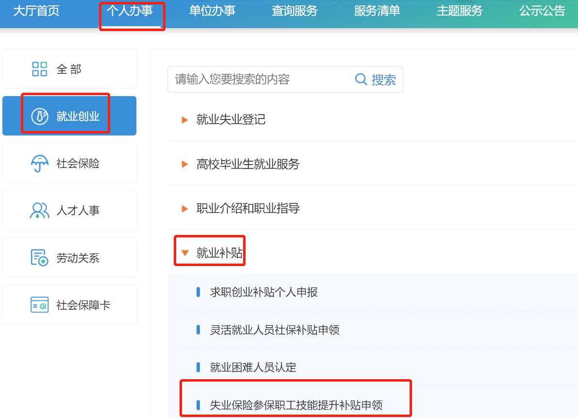 进入系统后,点击【个人办事】-【就业创业】-【就业-补贴】-【失业保险参保职工技能提升补贴申领】