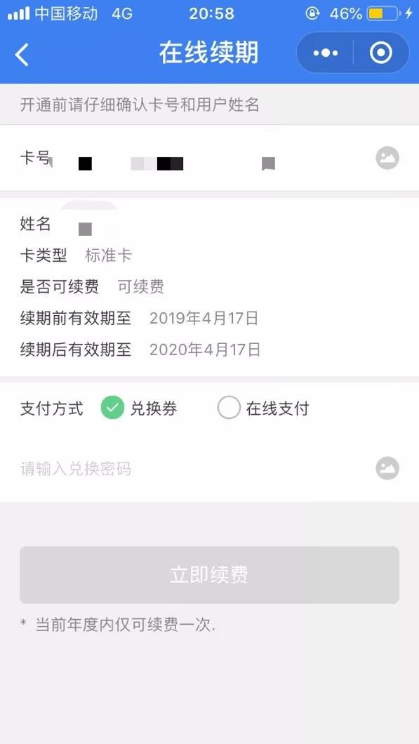兑换券方式开通:输入正确的园林卡续期兑换券密码,校验成功,点“立即开通”;