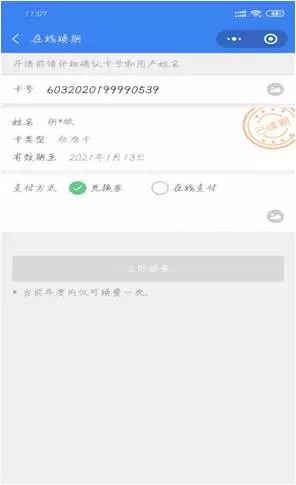 返回首页中【园林卡续期】,自动带出绑定卡号相关信息,可通过“兑换券”和“在线支付”两种方式续期;