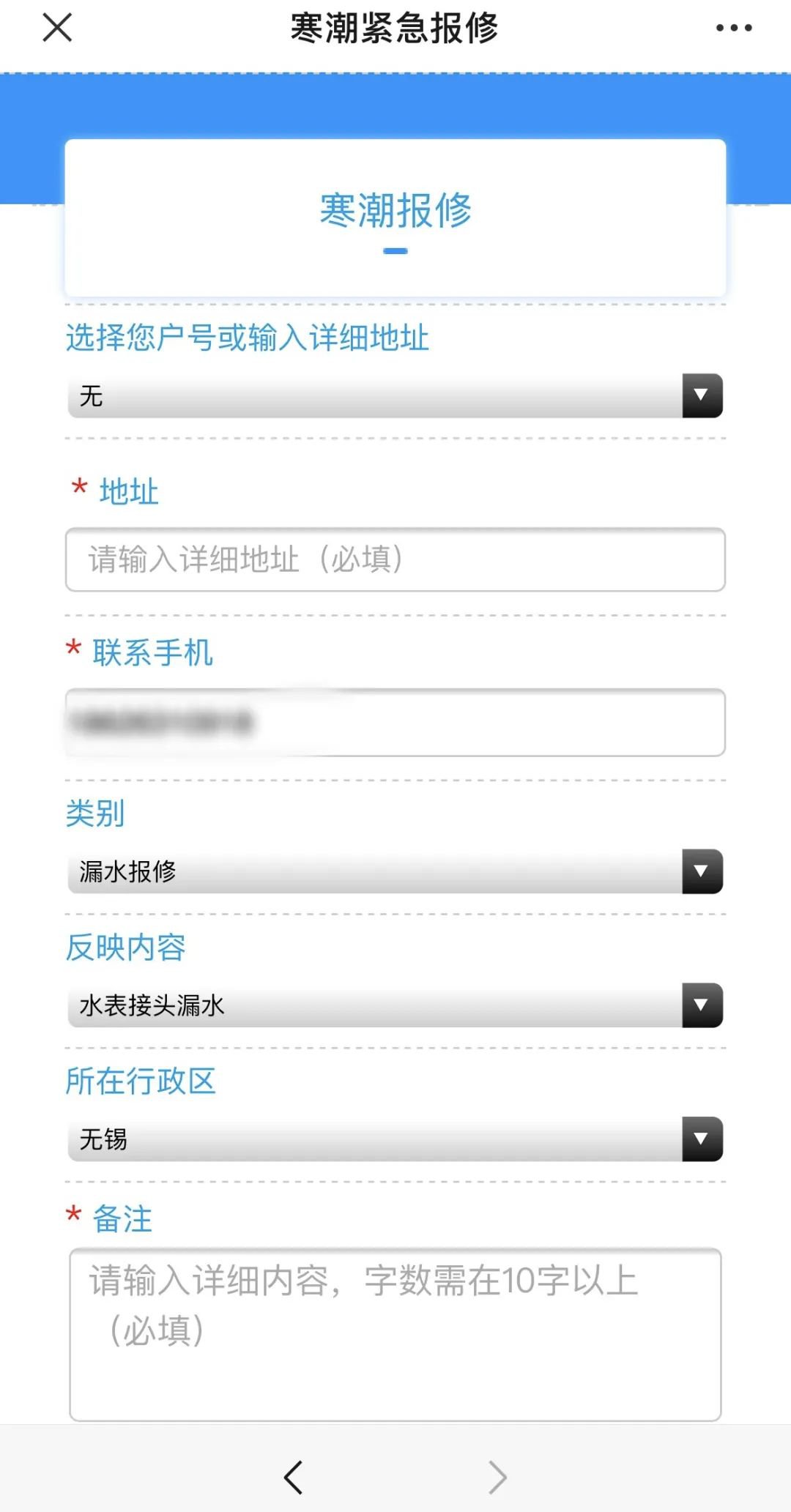 “地址”和“联系手机”填写时可以和注册登记的不一样哦,这样就可以轻松帮父母家报修啦~