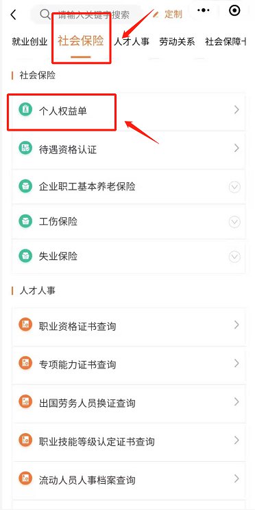 点击“社会保险”选择其中的“个人权益单”,即可查看
