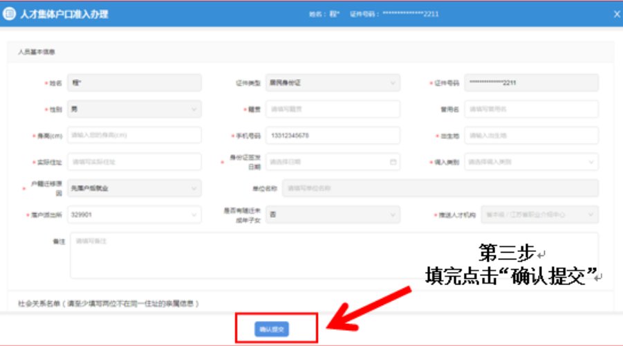 完成表格打印后,申请人携带盖章齐全的《落户人员情况表》和人才引进《落户联系单》至梁溪区公安分局办理户口迁移手续后,至上马墩派出所办理落户手续。