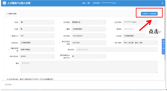 审核通过后,可进入页面点击右上角的《打印落户人员情况表》。如审核不通过的,按审核不通过原由重新提交申报信息。