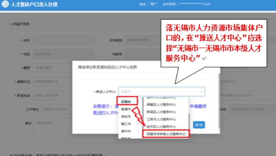落无锡市人力资源集体户口人员,在选择推送人才中心时请选择“无锡市---无锡市市本级人才服务中心”。