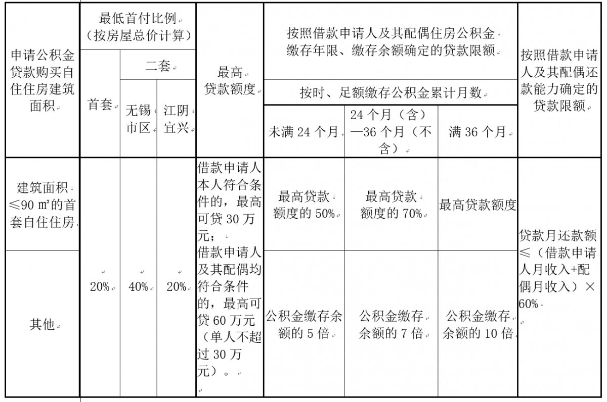 职工家庭在无锡市行政区域购买首套自住住房申请住房公积金贷款,首付比例不得低于房屋总价的20%;购买第二套自住住房申请住房公积金贷款,首付比例不得低于房屋总价的40%;在江阴、宜兴市购买自住住房申请住房公积金贷款,首付比例不得低于房屋总价的20%。