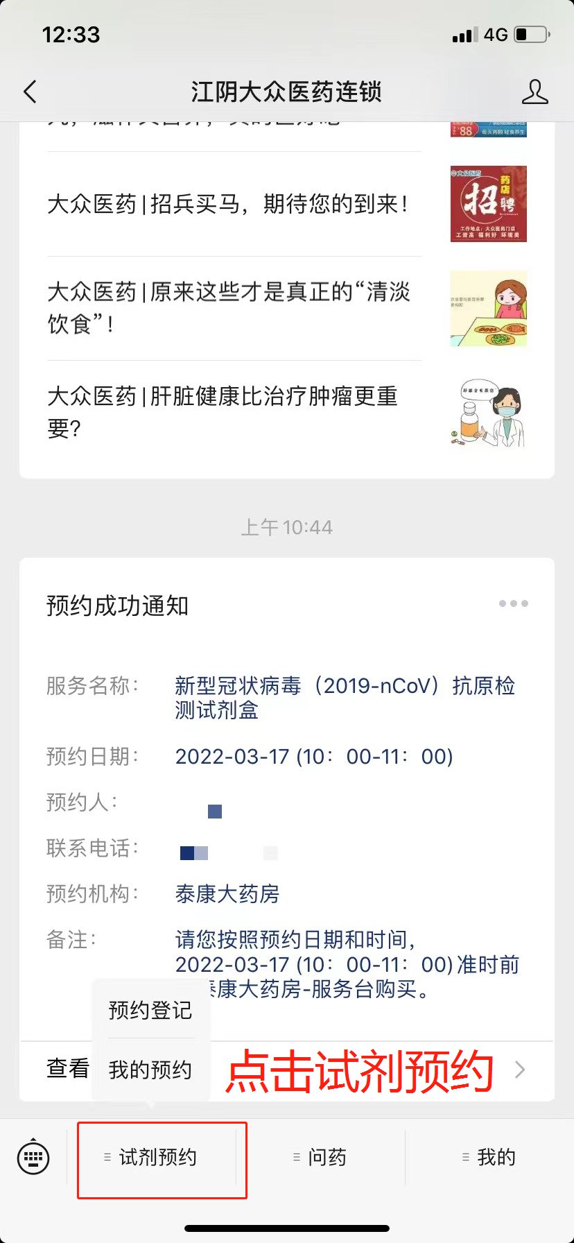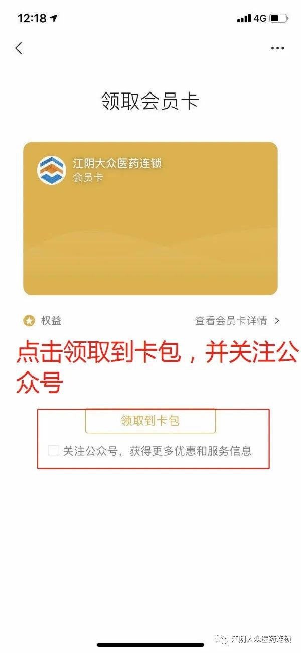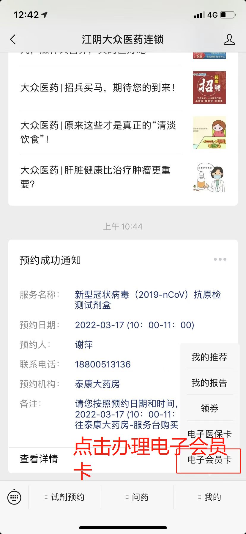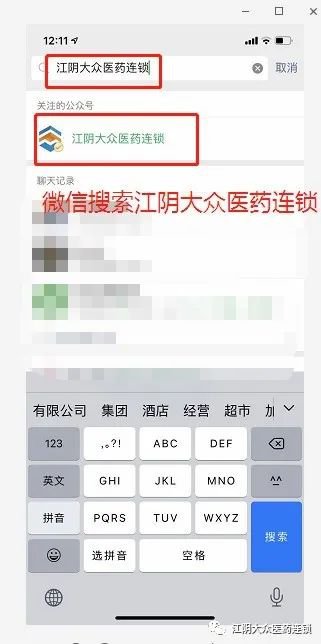 1,在微信公众号添加,关注“江阴大众医药连锁”。点击试剂预约,长按二维码进入公众号,领取电子会员卡,激活会员卡。