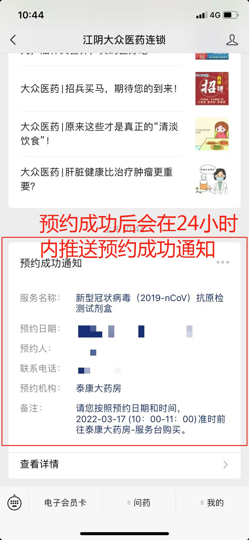 4,收到公众号推送的预约成功信息,按显示的预约时间到店购买,注意携带身份证再去店里购买。