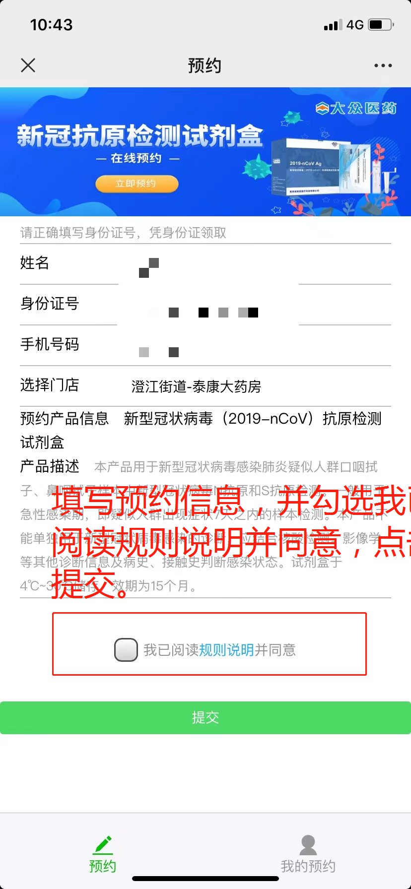 3,填写预约相关信息,选择取货门店(泰康大药房),点击提交,维护完成后可以在“我的预约” 中查看预约信息。
