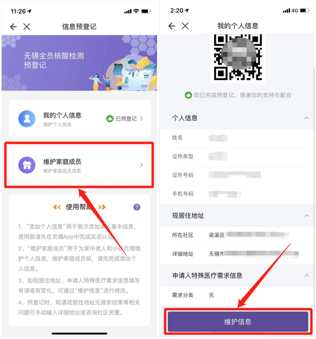 3、信息提交成功后,点击【维护家庭成员】可查看所添加成员的核酸检测预登记信息,如果所添加成员的信息需要修改,可以点击下方【维护信息】进行修改,再次重新提交即可。