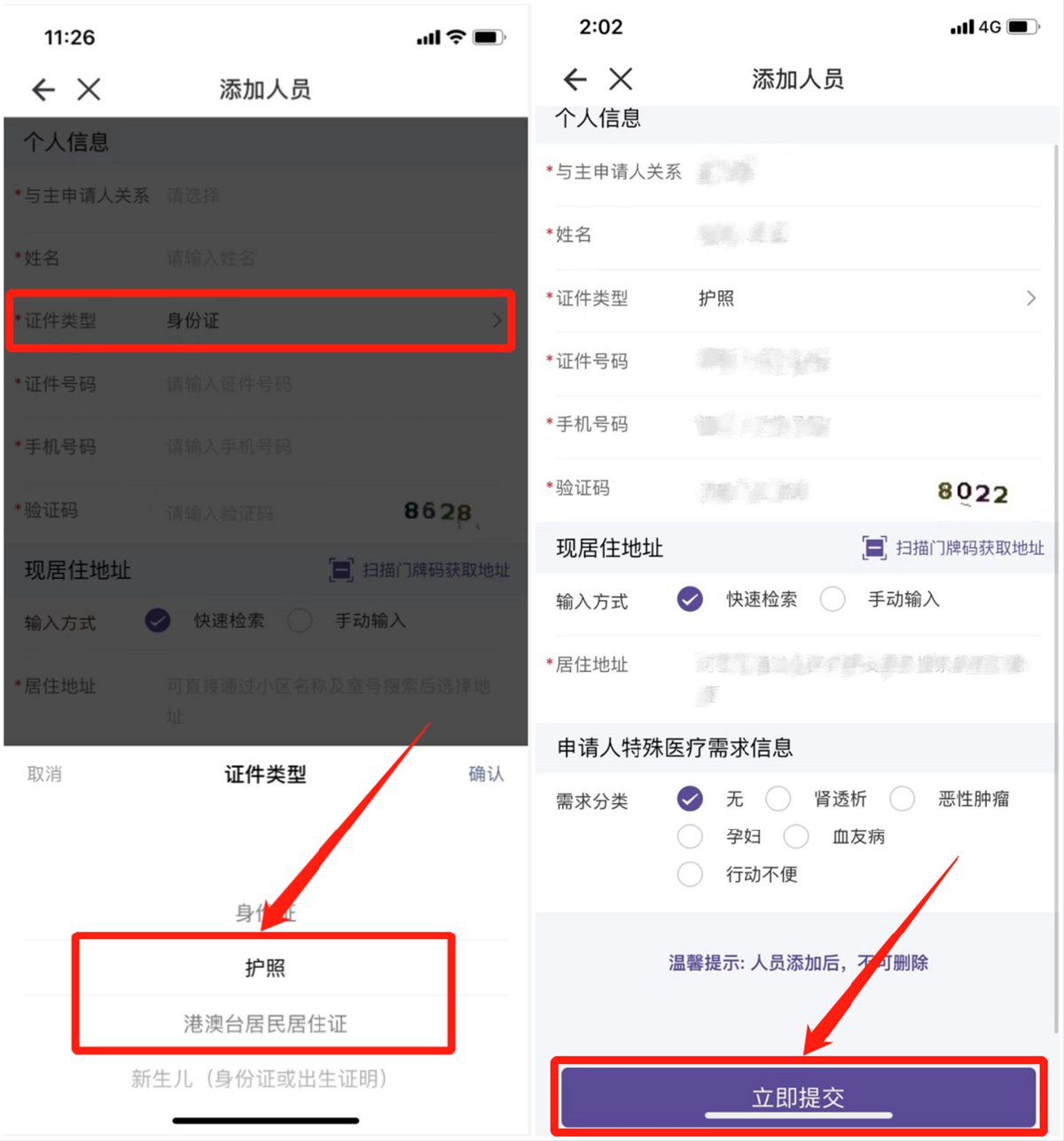 2、按页面提示填写所添加成员“与主申请人关系、姓名、证件类型(证件类型选择“港澳台通行证”或者“护照”)、证件号码、手机号码、现居住地址、特殊医疗需求”等信息后点击【立即提交】;