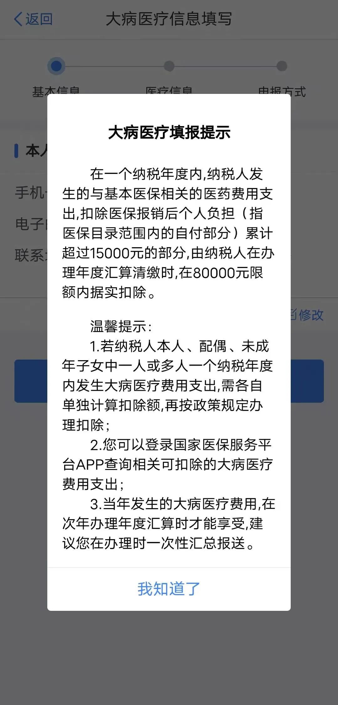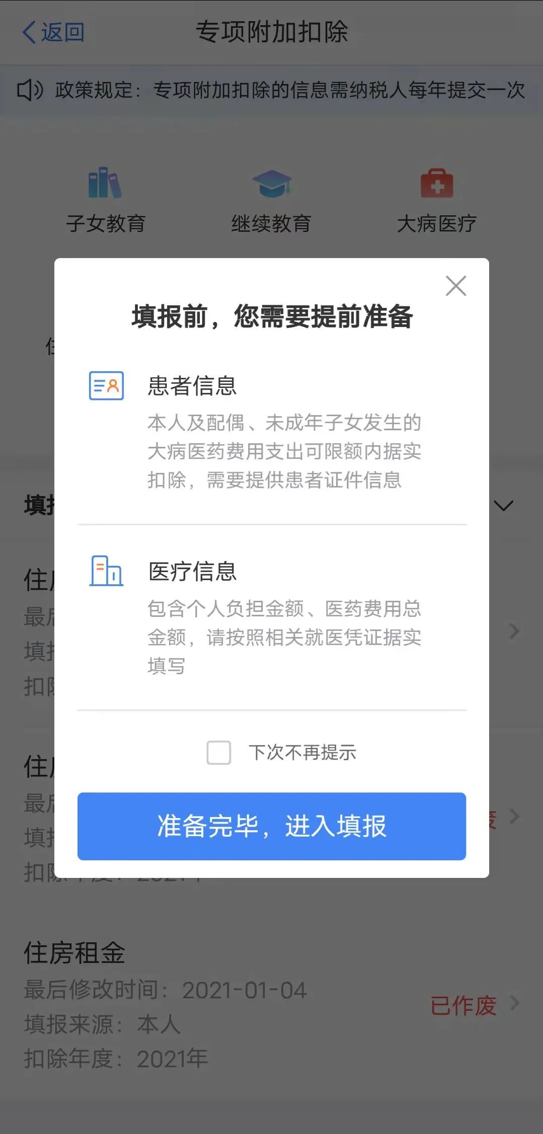 ◆点击“大病医疗”首先会弹出填报前所需资料准备的提示(若无需提示,可勾选“下次不再提示”),点击“准备完毕,进入填报”,需填写本人信息、扣除年度及医疗信息;