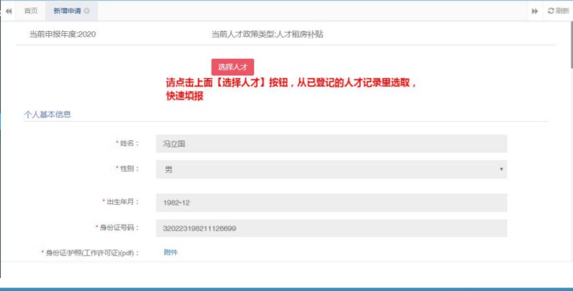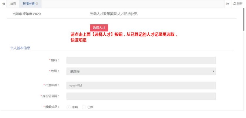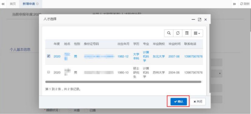 选中后,点击【确认】按钮,该人才基本信息即可在申报页面显示,申报页面灰色部分内容只能从人才登记的基本信息引入进来,不能直接填写,白色部分内容需手动填写。