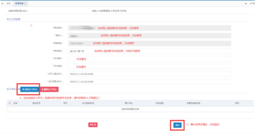 (2)申报提交点击首页【实习补贴申请】图标,进入实习补贴申请页面【提交】对应信息。