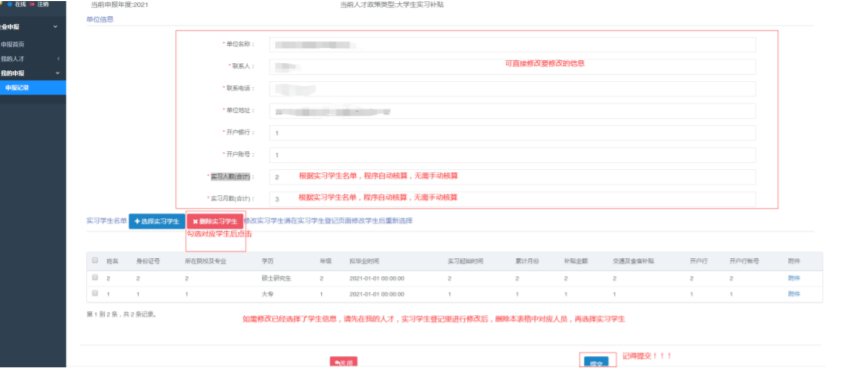 (3)申报修改删除【我的申报】【申报记录】中找到【退回】的实习补贴申报(申报提交后只有审核退回的记录才可以进行修改),选中一条点击【修改】【删除】。