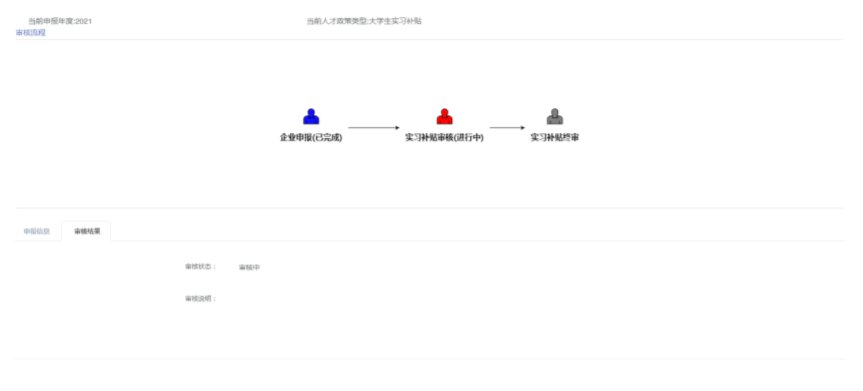 (4)申报跟踪注:实习补贴申请提交后,可在【我的申报】【申报记录】菜单下查看审核流程节点和审核结果。选中一条记录,点击【查看】按钮,可以看到当前审批的节点,待全部流程审核结束后,可以看到最终审核结果。