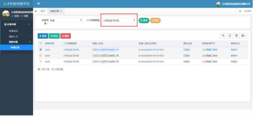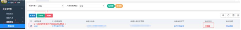 (3)申报修改删除【我的申报】【申报记录】中找到【退回】的实习补贴申报(申报提交后只有审核退回的记录才可以进行修改),选中一条点击【修改】【删除】。